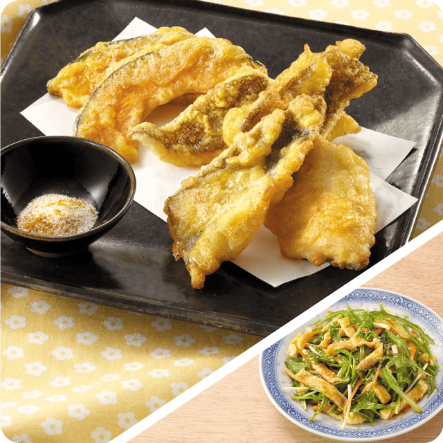 カレイのカレー天ぷら 水菜と玉子の中華和え