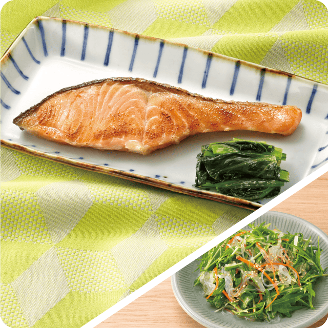 銀鮭の塩焼き 水菜と春雨の中華和え