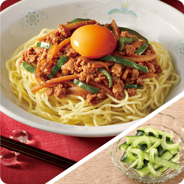 4と同じフライパンに油Bを熱し、水気を取った豚挽き肉・野菜ミックス(玉ねぎ・ピーマン)・たけのこ千切りを中火で炒める。野菜がしんなりし豚挽き肉に火が通ったら、付属調味料を加えてからめながら炒め、4の中華麺にかけ中央をくぼませ卵黄をのせる。