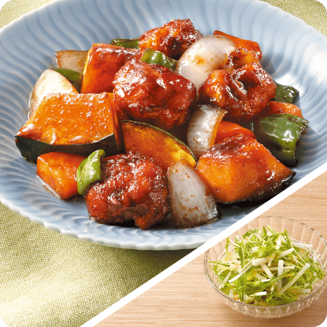 | 南瓜入り豚こまDE黒酢酢豚 | ||