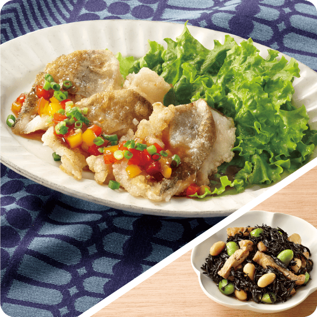 たらのカリカリ香味揚げ お豆のひじき煮