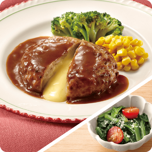 チーズインハンバーグを袋から取り出し耐熱容器に入れ、ラップをかけて電子レンジで加熱する(2人用:3分、3人用:4分半)。