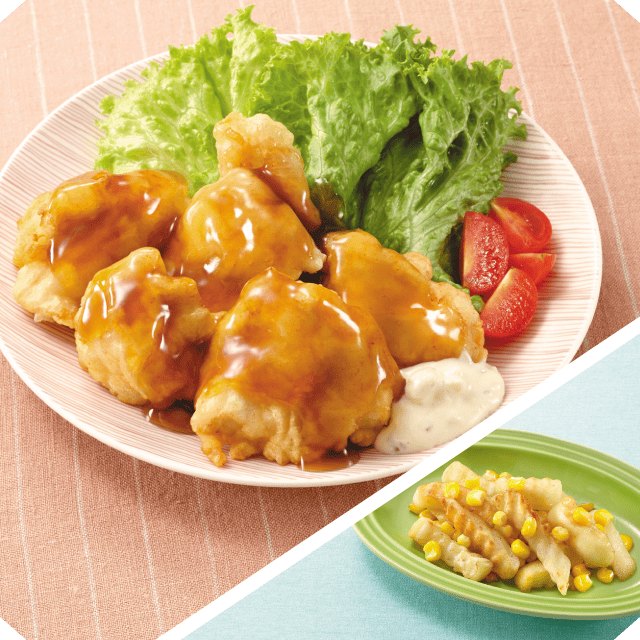 別のフライパンに付属調味料を入れ温め、4の鶏むね肉を戻してからめ、3の器に盛り、タルタルソースを添える。