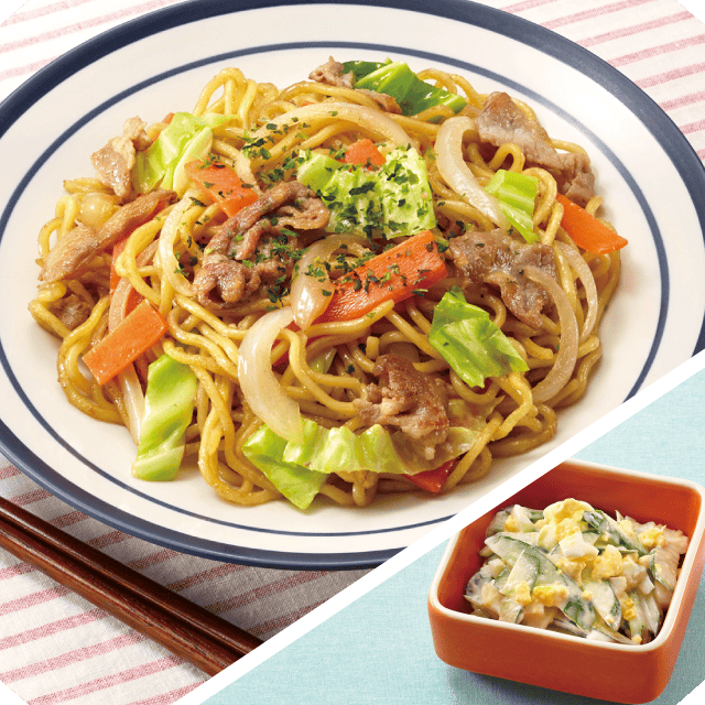 中華風焼きそば ゆで卵ときゅうりのサラダ