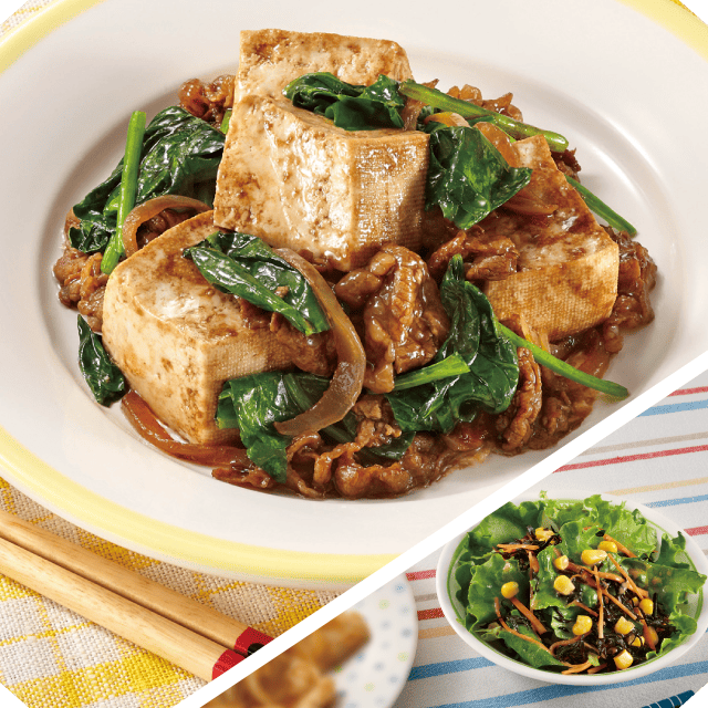 5と同じフライパンに牛ばら肉・玉ねぎ・塩・こしょうを加え中火で炒め、玉ねぎが透き通ったら4の小松菜・5の木綿豆腐を戻し入れ、強火で炒める(目安:30秒)。付属調味料を加え、からめながら炒める。