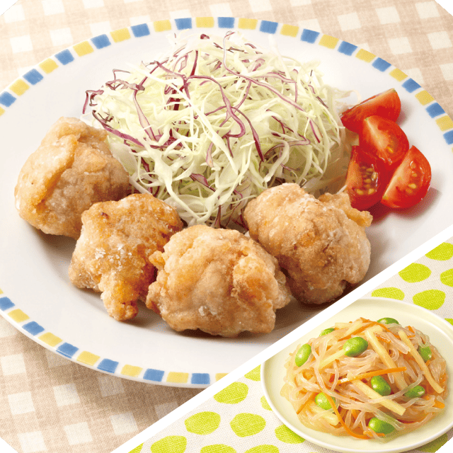 豚ロース肉の唐揚げ 糸こんと枝豆の煮物