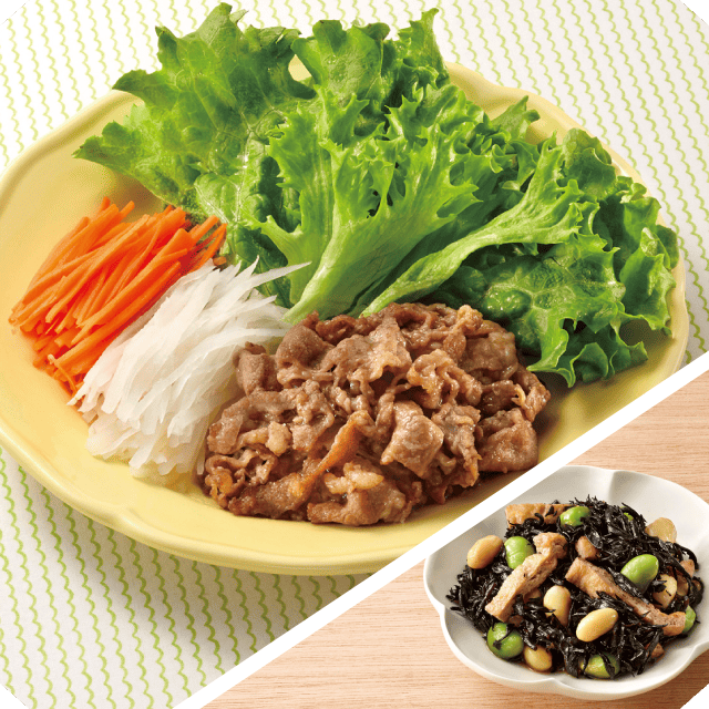 巻いて食べよう!牛焼肉の野菜巻き お豆のひじき煮