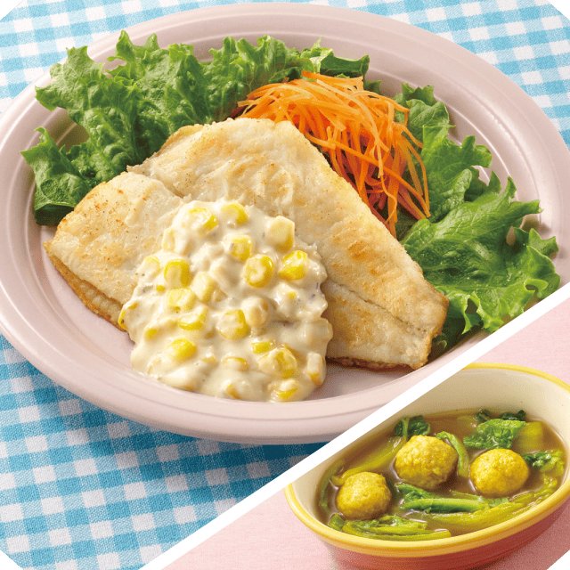 カレイのコーンタルタルがけ 白菜と鶏団子のカレーコンソメ煮