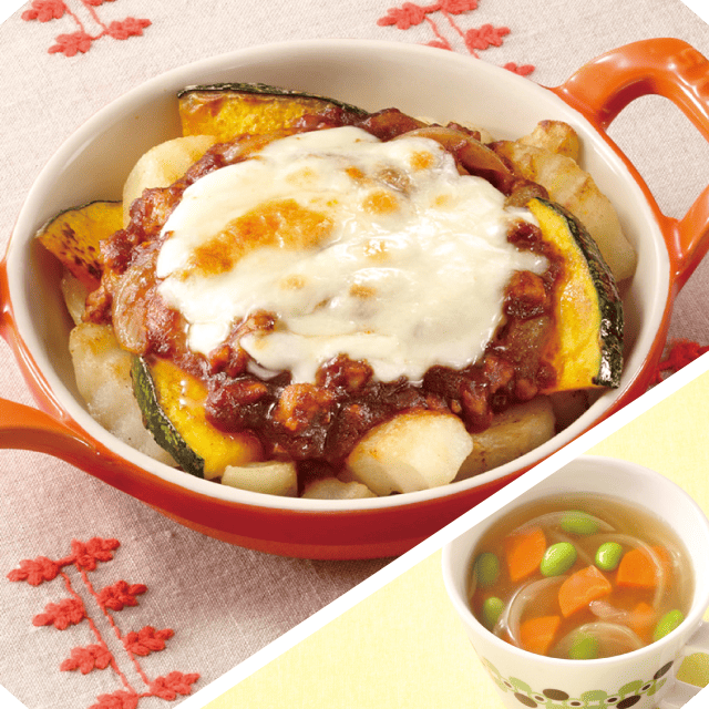 フライドポテトで作る かぼちゃとポテトのミート焼き 野菜のコンソメスープ