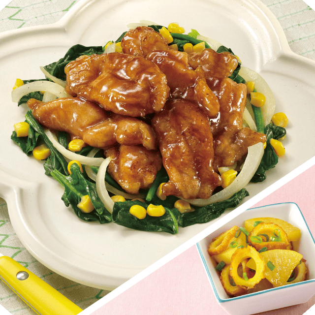 両面に焼き色がつき火が通ったら、付属調味料を加えからめ2の器の中央に盛る。 -