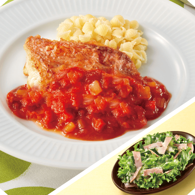 赤魚のムニエル トマトソースかけ ハムとレタスのサラダ