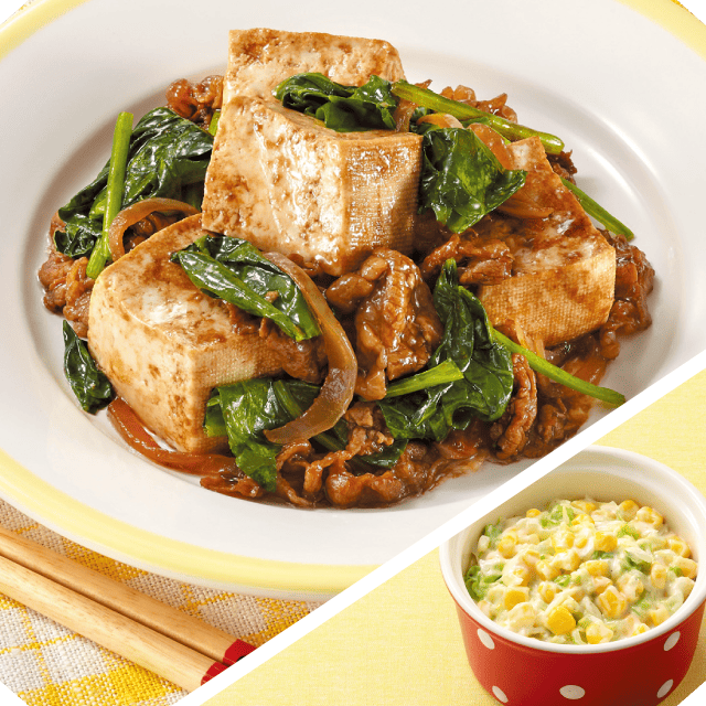 牛肉と豆腐の炒め物 キャベツとコーンのコールスロー