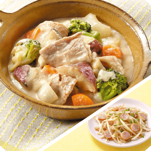 豚肉とさつま芋のまろやかみそクリーム煮 もやしとウインナーのソテー