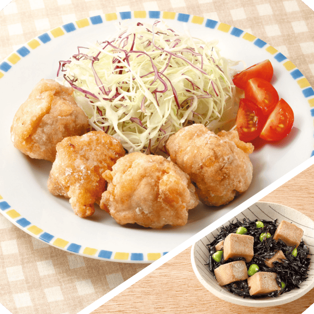 豚ロース肉の唐揚げ ひじきと高野豆腐の煮物