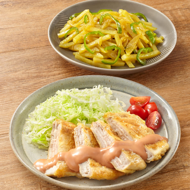 ミルフィーユポークピカタ じゃが芋とピーマンのカレー炒め