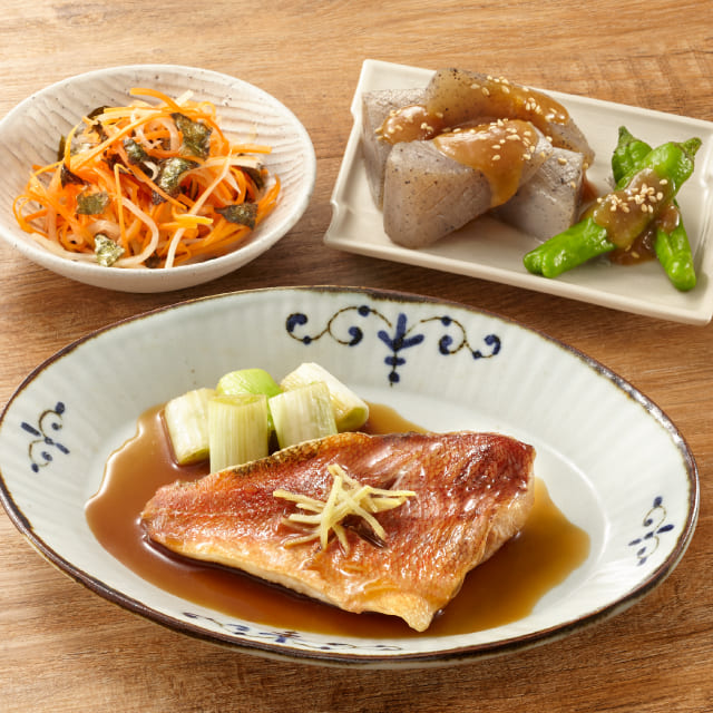 赤魚の煮付け こんにゃく田楽 大根と人参の海苔和え