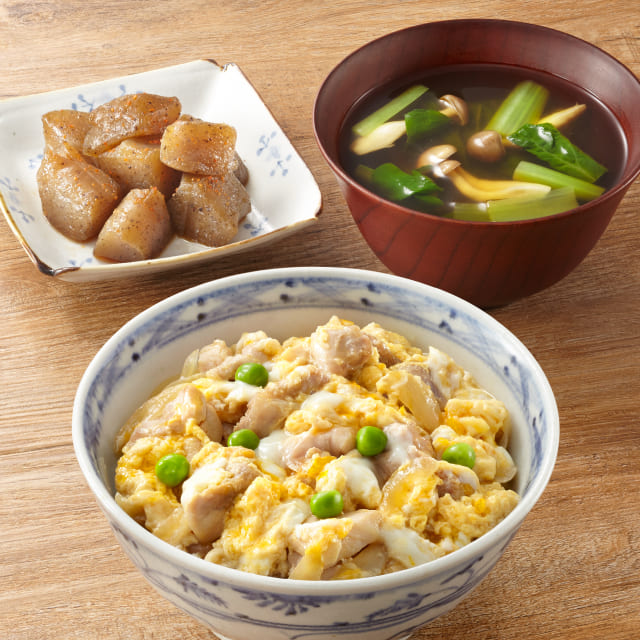 親子丼 ピリ辛こんにゃく 小松菜としめじのすまし汁 ※消費期限はお届け日当日です。